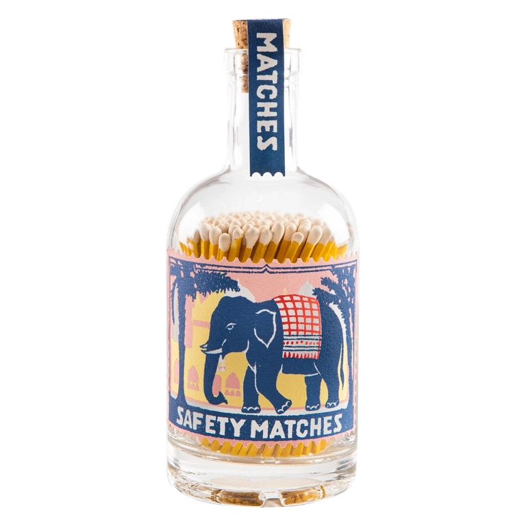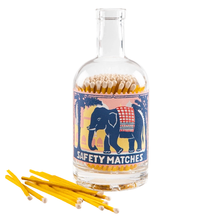 Our match bottle that takes inspiration from our Pink Elephant vintage matchbox design, featuring a blue elephant with a red blanket, strolling in front of a pink sunset.