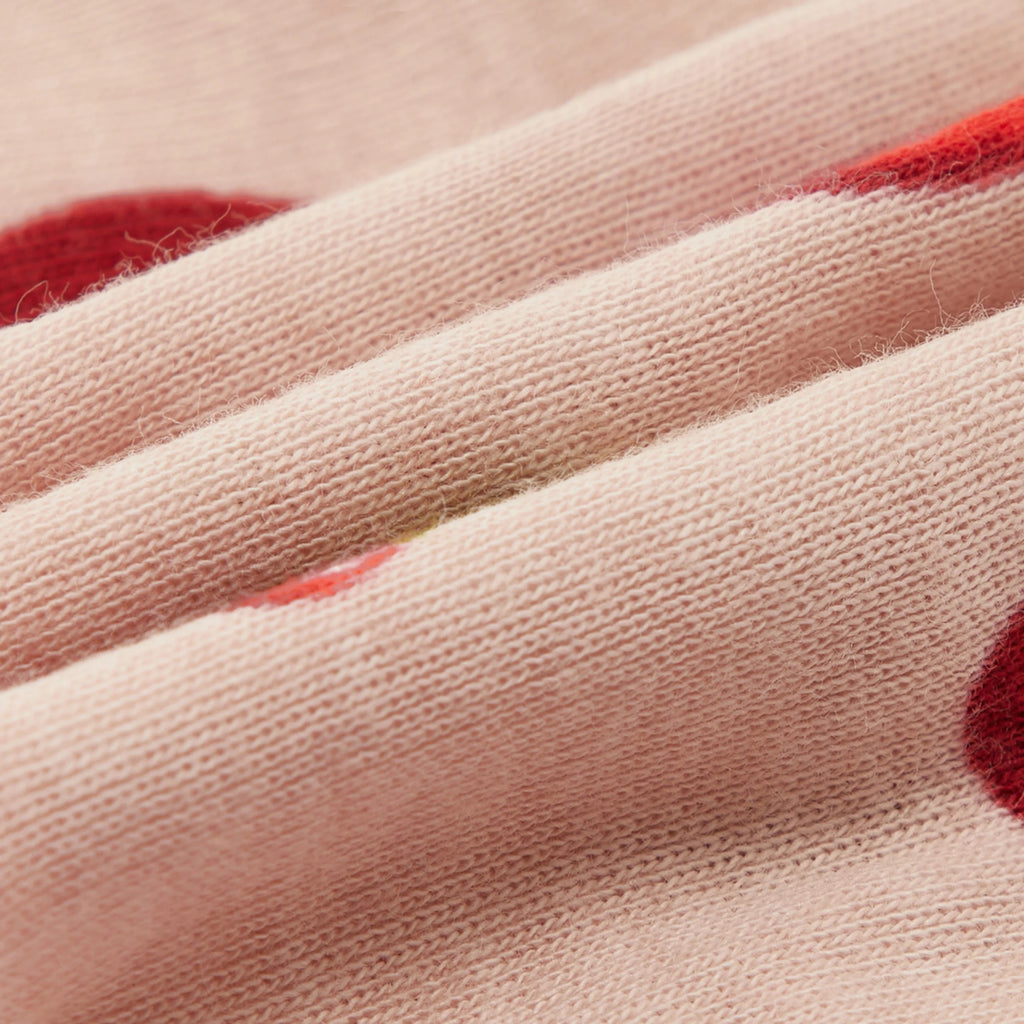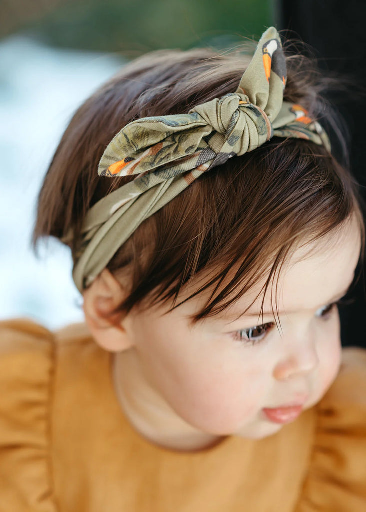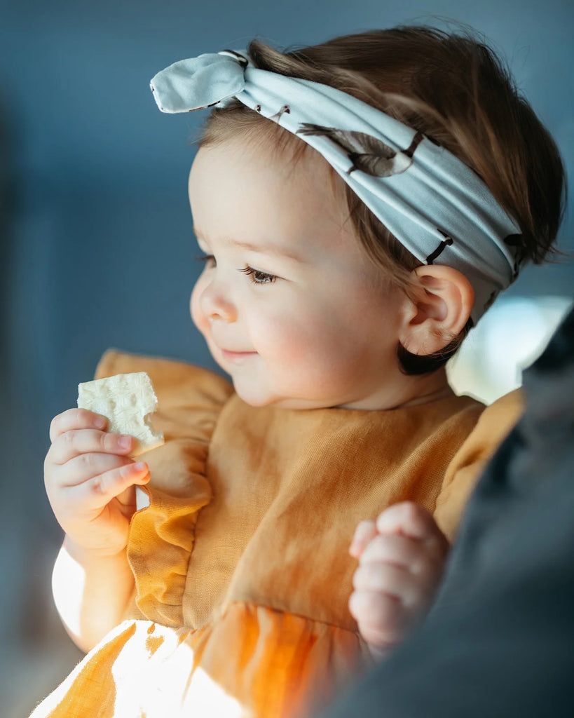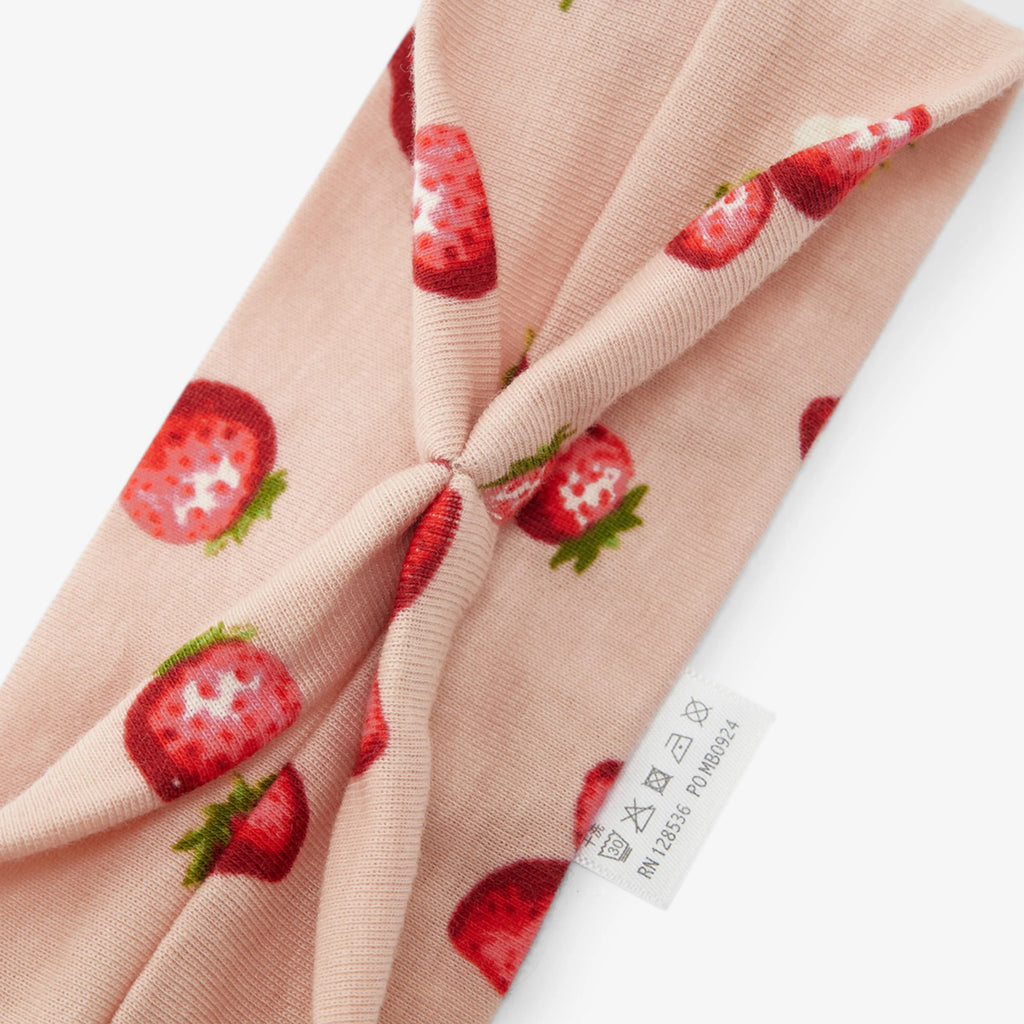 Easily slip on our knotted organic cotton Headband in the Strawberry print for a subtle coordinating accent to your little one's ensemble. One size fits most babies and toddlers. We package each Headband on a sturdy paperboard hanger.
