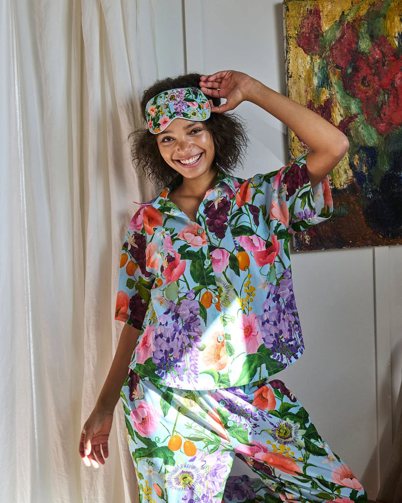 Slip into total bliss. Our Spring In The Air Velvet Eye Mask is soft, sumptuous, and perfect for shutting out the world. Whether it’s a quick power nap or a long weekend lie-in, this little mask turns every snooze into a luxe escape. Made from 100% cotton velvet featuring cheerful springtime florals and fresh fruits on a soft blue with pale blue cotton backing and covered elastic headband.