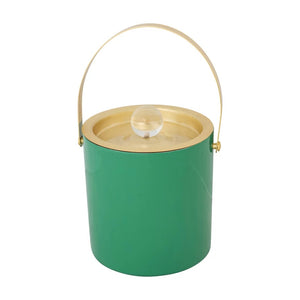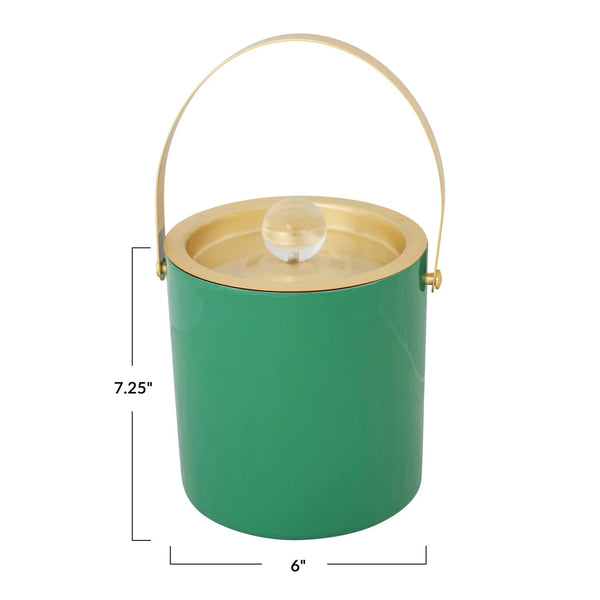 6" Round x 7-1/4"H 1-1/2 Quart Enameled Stainless Steel Ice Bucket w/ Lid & Glass Knob, Gold Finish & Green Color